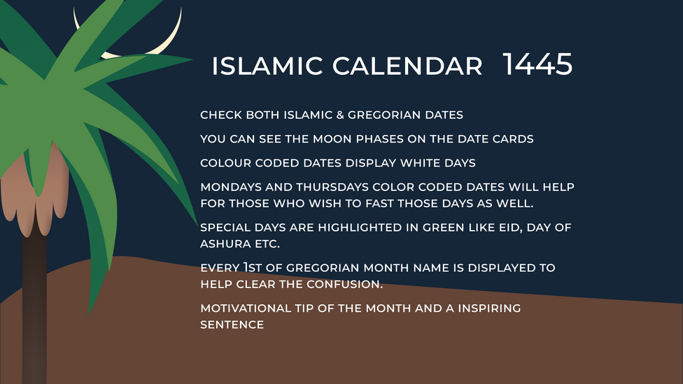 Islamic Calendar for the year 1445 which also includes Gregorian calendar for the year 2023-2024It can be purchased from the Store